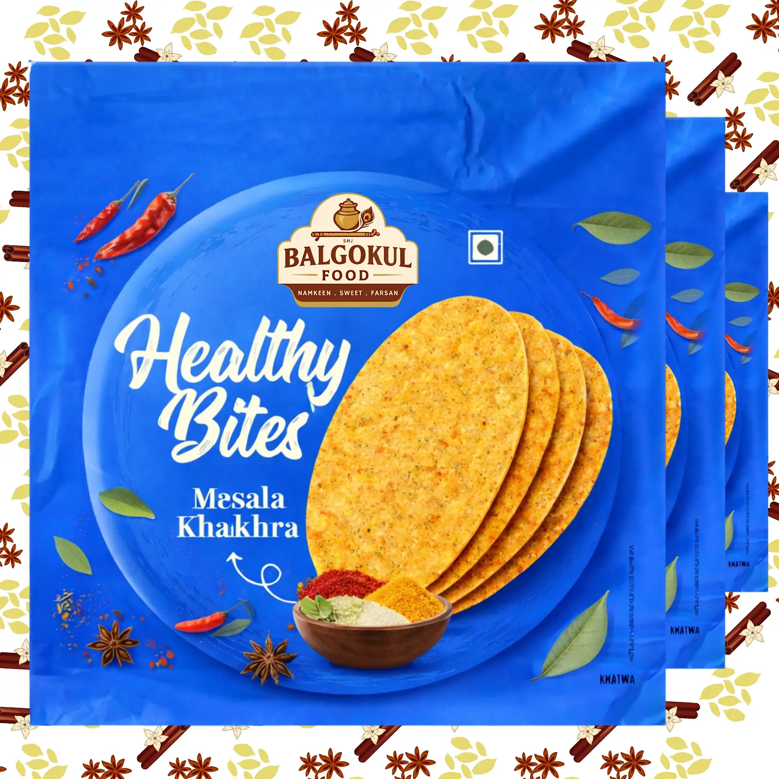 Relish the bold flavors of Indian spices with BalGokul Foods Healthy Bites – Masala Khakhra. Made using premium whole wheat flour and a balanced blend of handpicked spices, this khakhra is roasted to achieve a light, crispy texture without compromising on taste.