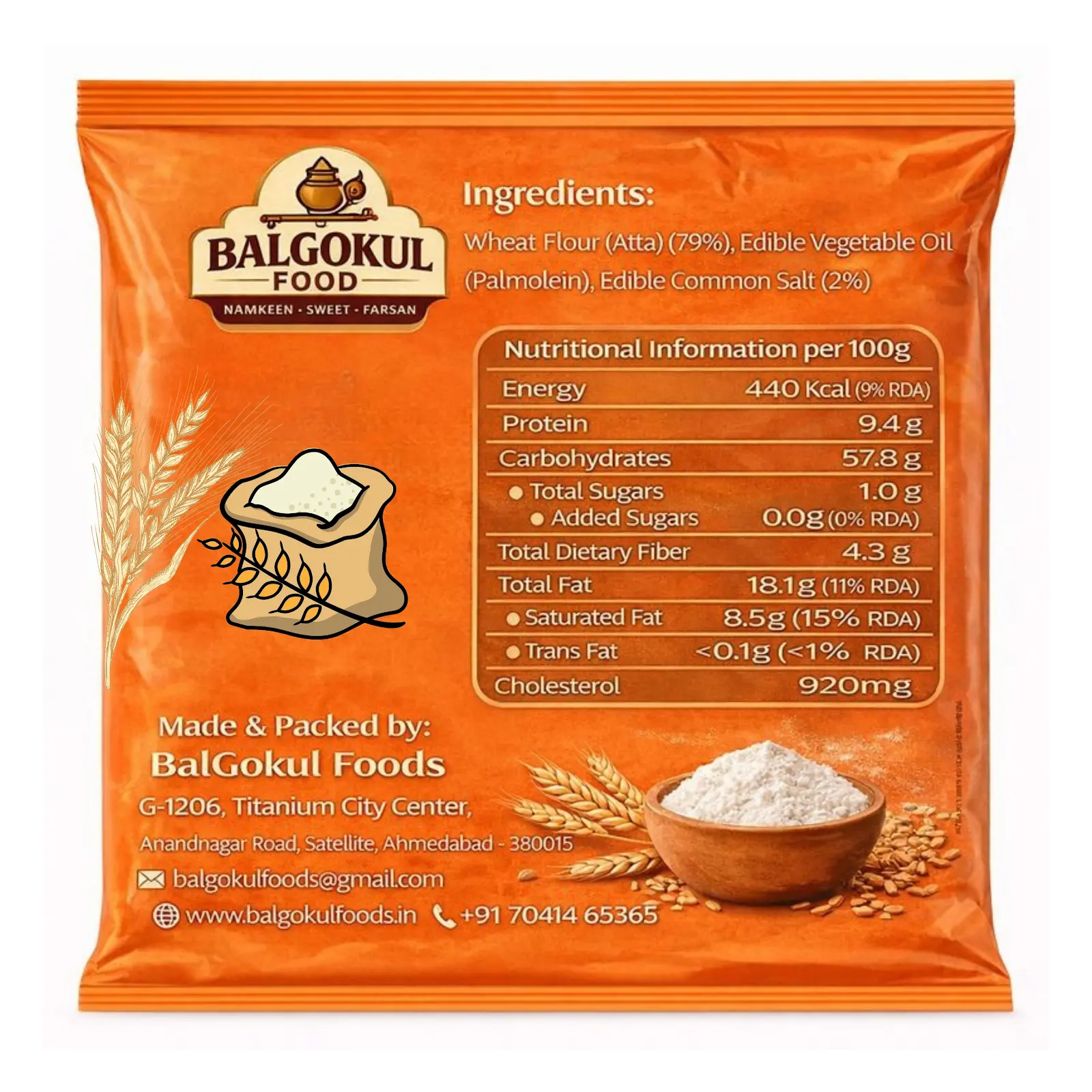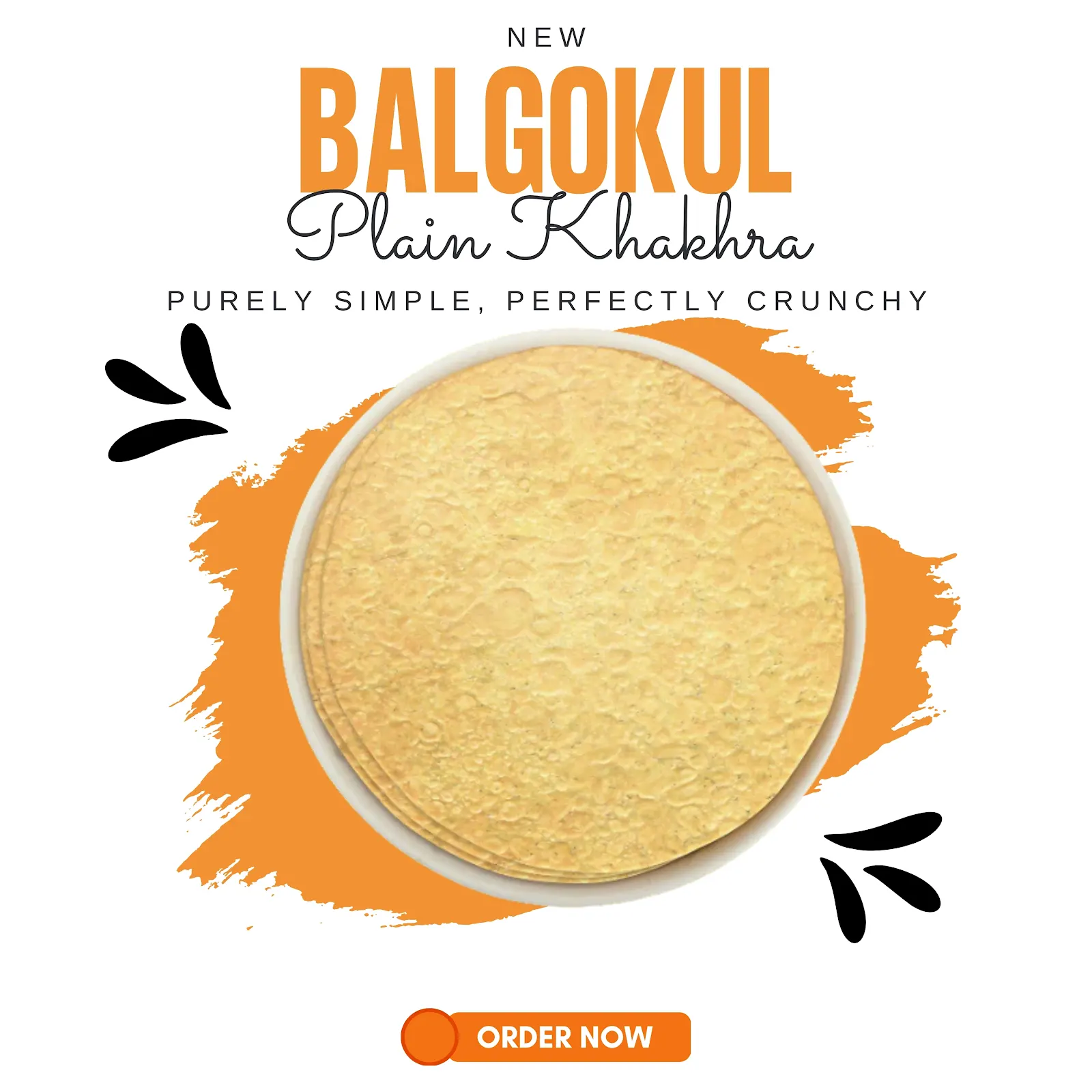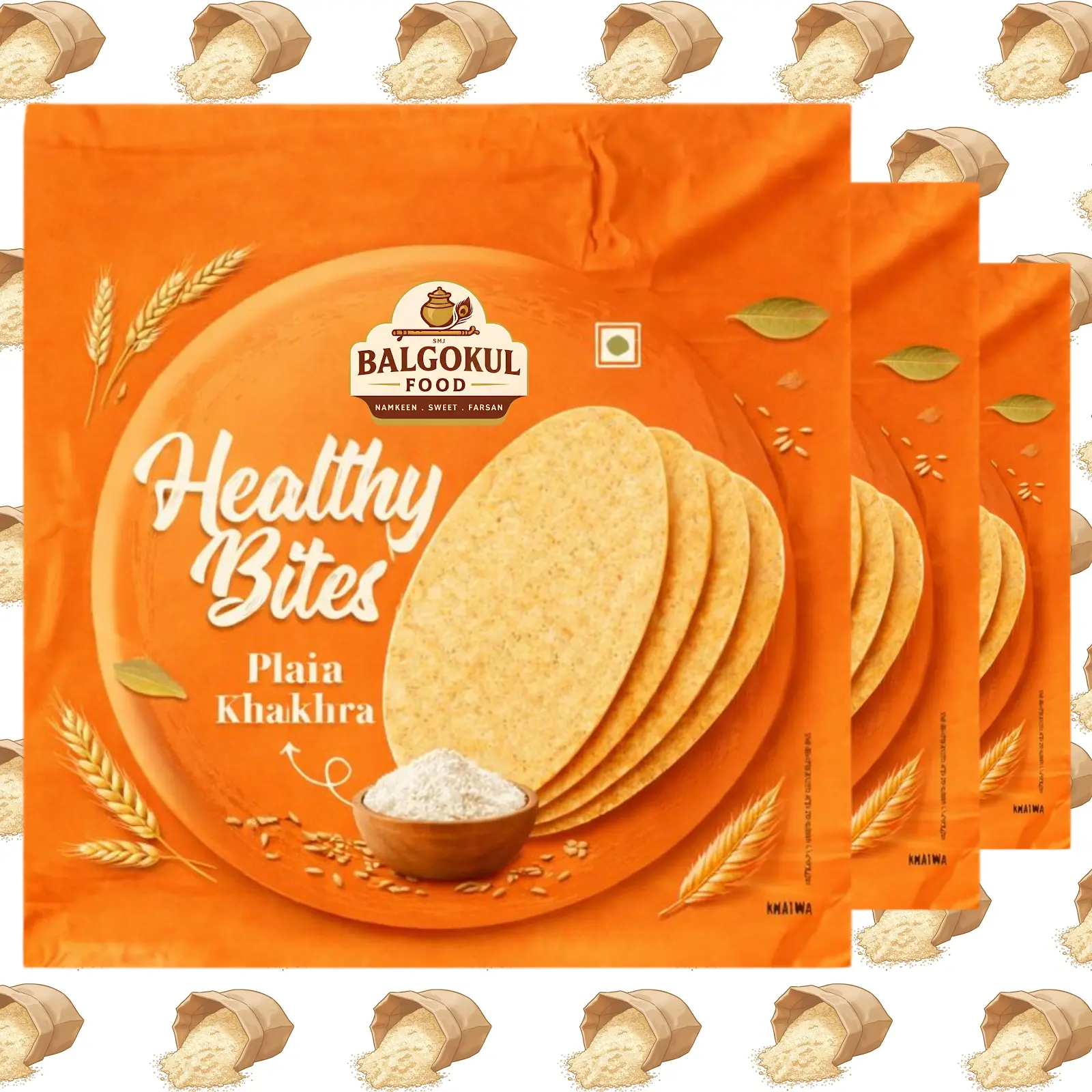 Simple, light, and wholesome — BalGokul Foods Healthy Bites – Plain Khakhra is made from premium whole wheat flour and roasted to crisp perfection. With minimal ingredients and no unnecessary spices, it delivers a clean, authentic taste that’s easy on the stomach and perfect for everyday snacking.
