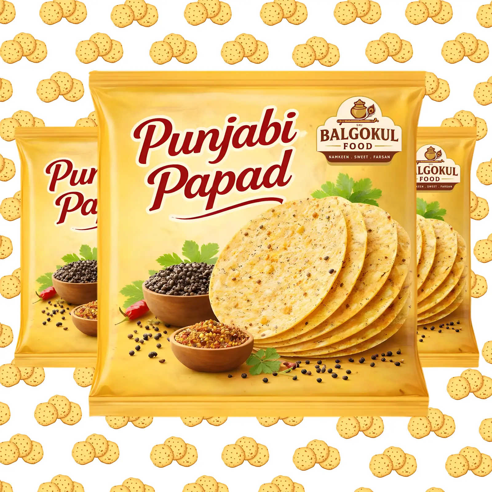Bring home the bold, traditional taste of North India with BalGokul Foods Punjabi Papad. Made from high-quality urad dal (black gram) flour and blended with aromatic spices, this papad delivers a rich crunch with a spicy Punjabi punch.