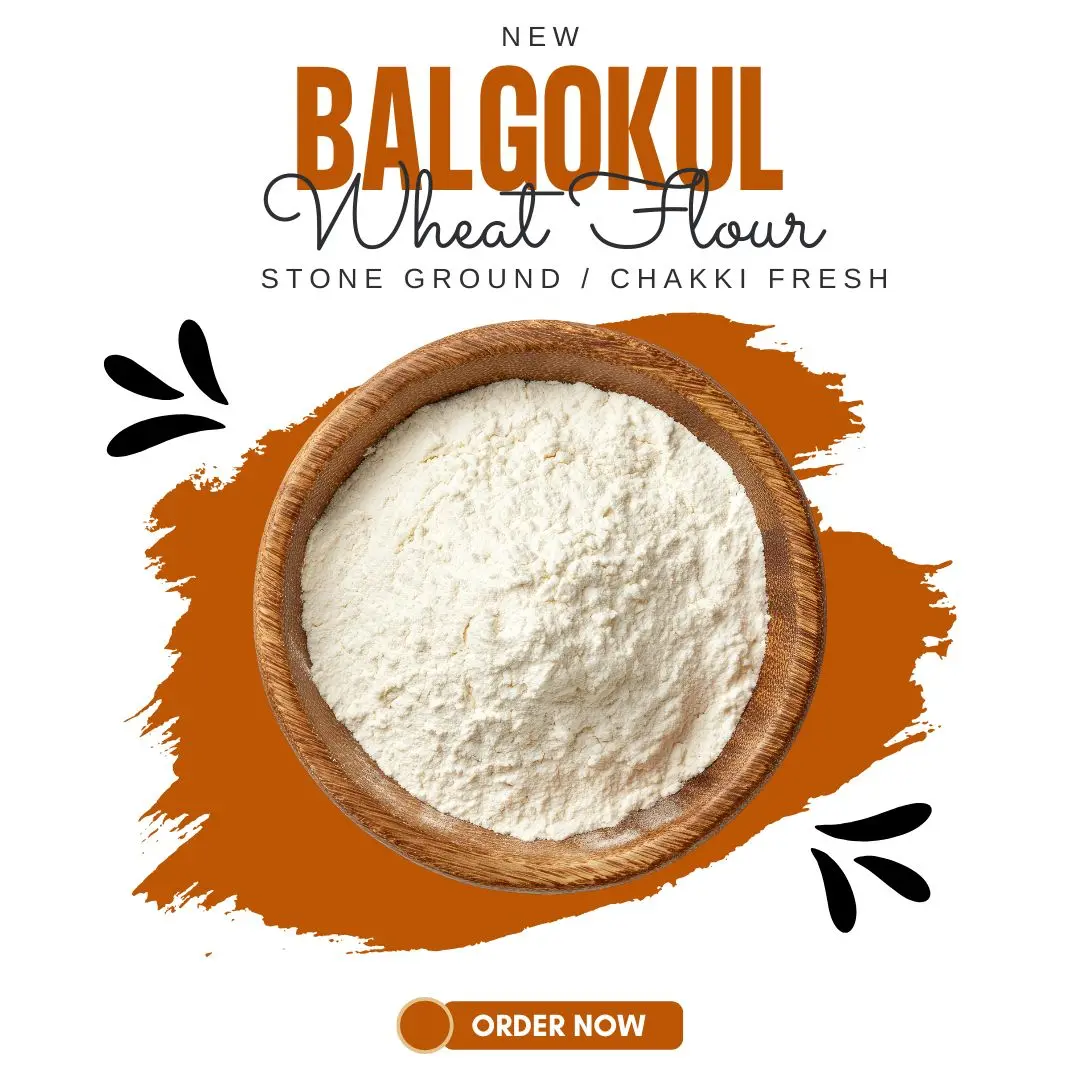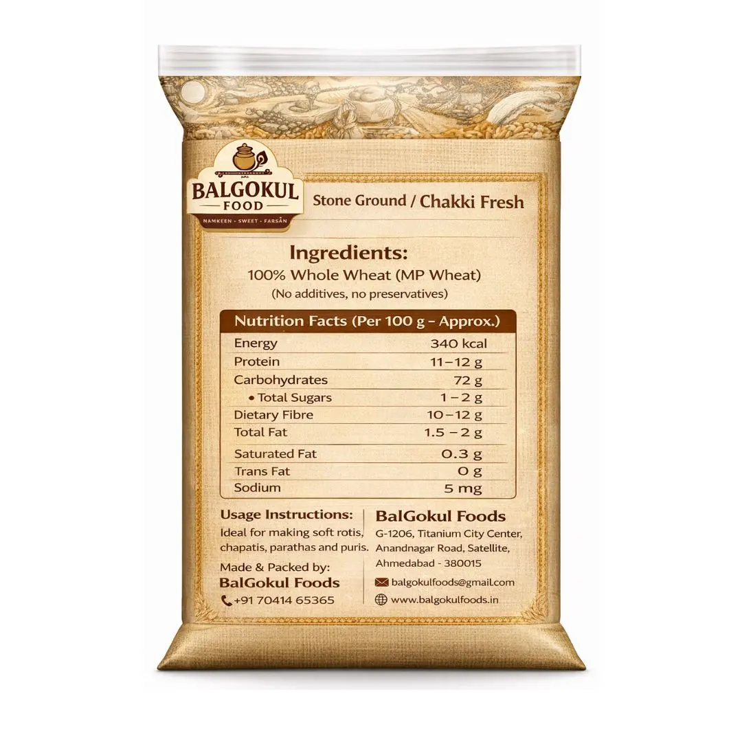 BalGokul Foods Superior MP Atta is prepared using carefully selected Madhya Pradesh wheat and stone-ground to retain natural fiber, taste, and nutrition. This chakki-fresh atta delivers soft, fluffy rotis, chapatis, parathas, and puris with consistent quality. Hygienically milled and packed without any additives or preservatives.